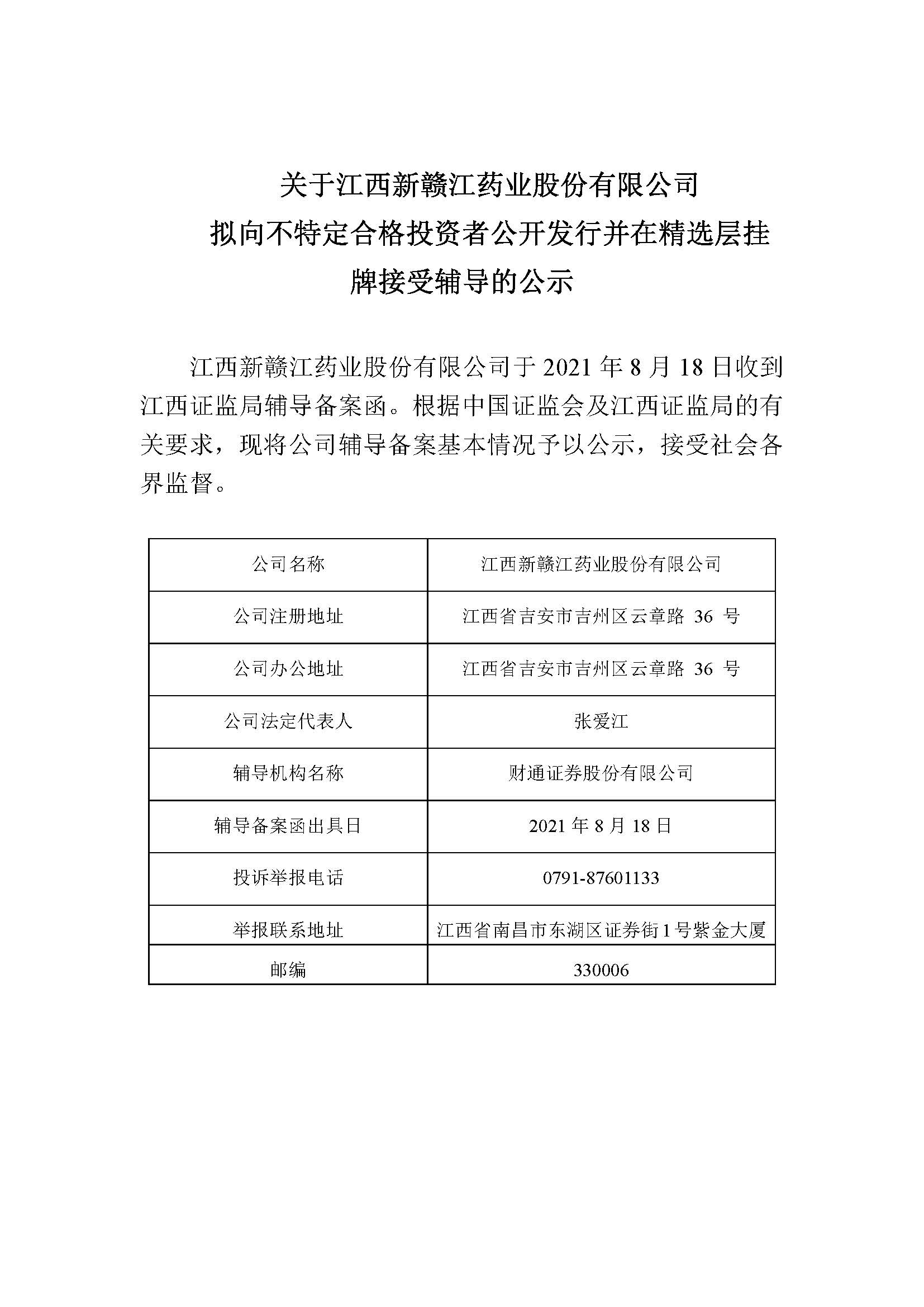 江西新贛江藥業股份有限公司于 2021年8月18日收到江西證監局輔導備案函, 根據中國證監會及江西證監局的有關要求,現將公司輔導備案基本情況予以公示, 接受社會各界監督。